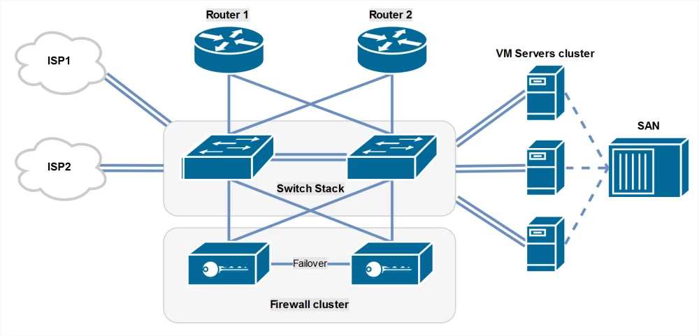 У нас это выглядит следующим образом — вся сетевая инфраструктура задублирована и в каждый сервер воткнуты кабели, идущие от разных сетевых устройств. Между собой эти устройства тоже подключены двумя «хвостами». Каждое хранилище данных подключено к серверам несколькими оптическими кабелями. Внутри серверов диски объединены в избыточные массивы, продолжающие работать даже в случае выхода отдельных дисков из строя, то же самое в СХД. Оперативная память в серверах не обычная, а с коррекцией ошибок, что позволяет избежать проблем в случае солнечных бурь и других электромагнитных флуктуаций. Серверы объединены в кластер, который способен быстро и без потери данных восстановить работу сервисов в случае выхода из строя одного или нескольких серверов. Звучит всё это довольно внушительно, но у крупных компаний, надо сказать, всё гораздо круче, хоть и стоит, как золотой паровоз.