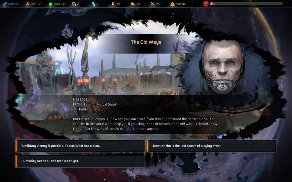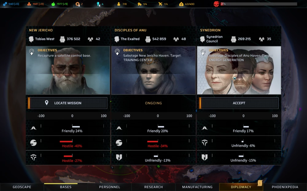 Поскольку фракции представляют собой конкурирующие образования, взять и наладить отношения сразу со всеми, к сожалению, не удастся — политические баталии в Phoenix Point представляют собой игру с нулевой, а то и отрицательной суммой, то есть практически каждое улучшение взаимоотношений с одной фракцией будет неодобрительно воспринято остальными двумя. Дипломатия важна по многим причинам, но основная заключается в том, что самые «вкусные» технологии можно получить, только наладив отношения или попросту сцап-царапав ©. Помимо промышленного шпионажа можно торговать, выкупать рекрутов, а также выполнять задания одной фракции против другой, совершая вполне себе агрессивные налёты.
