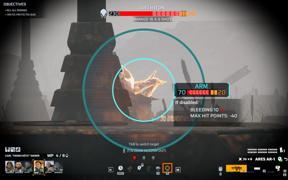 Усугубляется это тем фактом, что пострелять теперь можно не только в абстрактного «врага», но и, в лучших традициях Фаллаута — в отдельные части его тела, с разными последствиями. Например, отстрелив конечность, держащую оружие — вы логично лишите противника возможности его использовать. Прострелив ногу — уменьшите скорость передвижения, ну и так далее. То же самое справедливо и для ваших солдат — поэтому рекомендуется не высовывать важные части тела из-за укрытий.