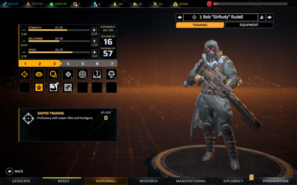 По мере участия в сражениях, ваши солдаты, разумеется, будут накапливать опыт и получать возможности для левел апов с новыми скиллами. Стандартная система дополняется возможностью прокачать основные параметры — выносливость, силу воли и скорость, влияющие на количество НР, грузоподъёмность, запас очков, используемых скиллами и дальность передвижения. Пул скиллпоинтов, затрачиваемых на всё это — общий.