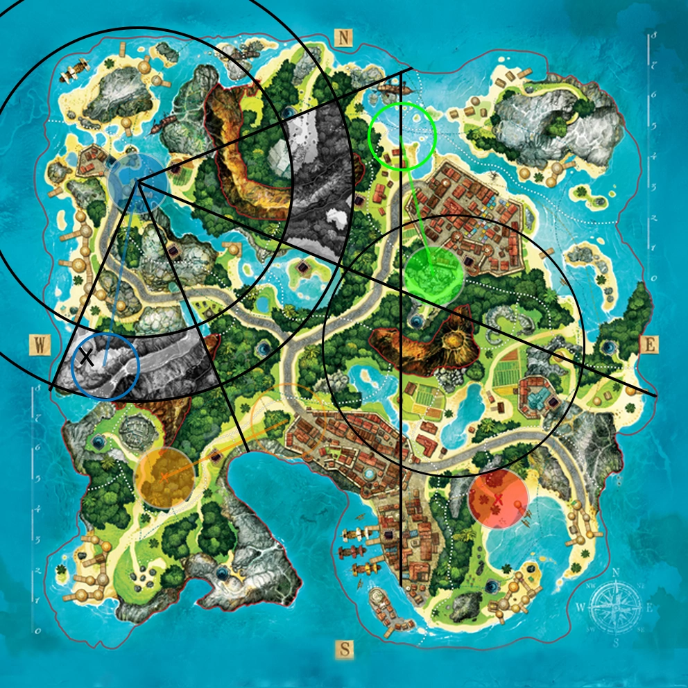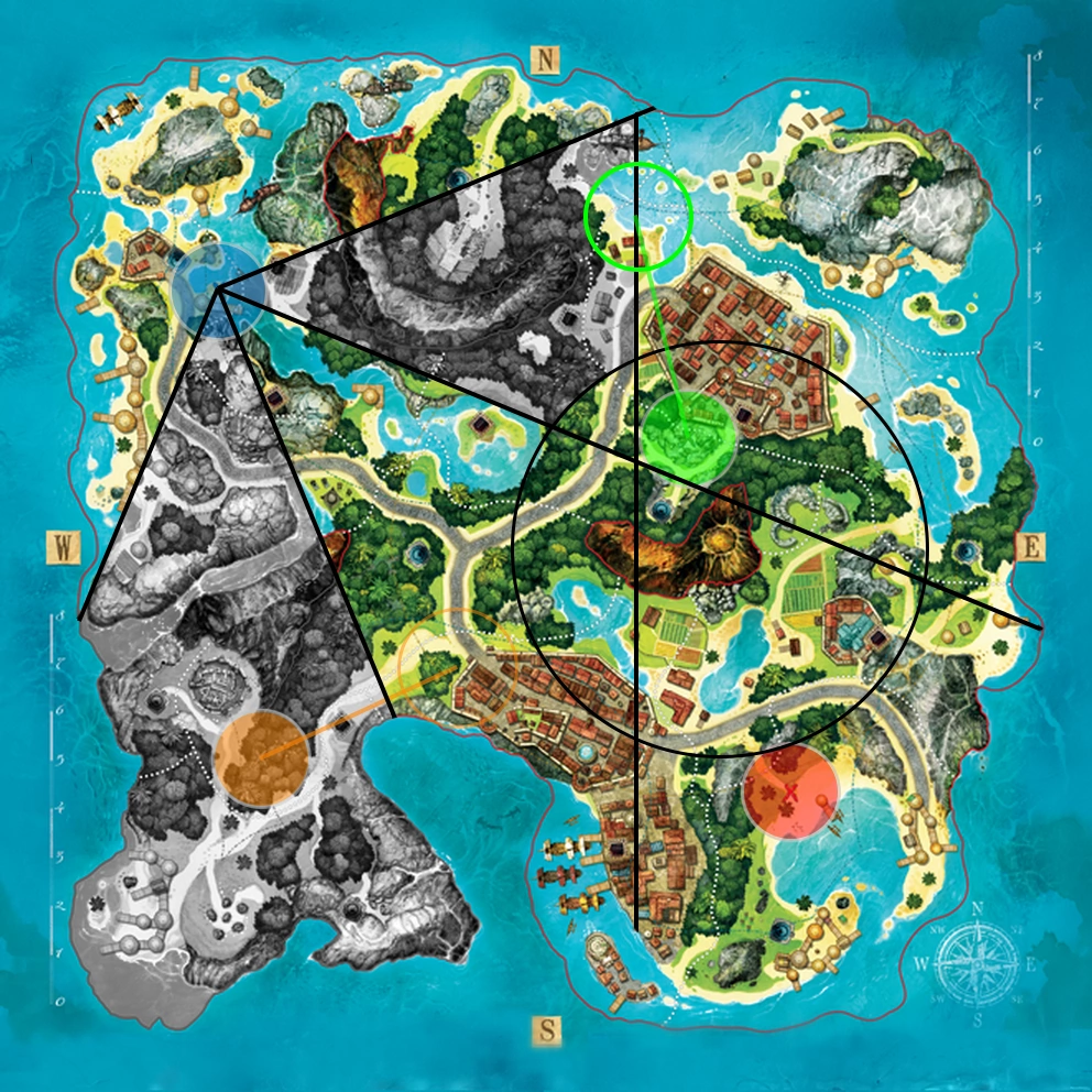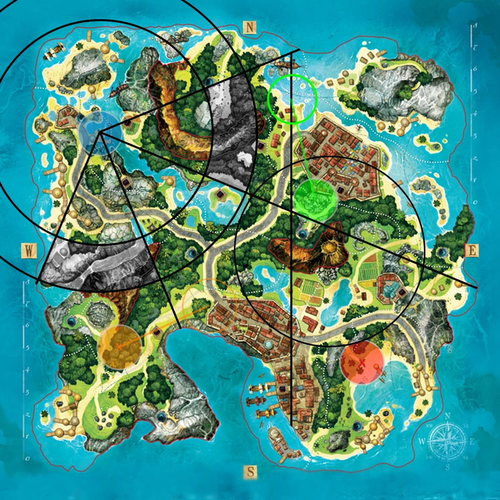 Я позволил себе слегка зафотошопить карту для того, чтобы было лучше видно — в процессе нанесения новой информации будем придерживаться следующей логики: чёрно-белые участки — это «терра инкогнита», то есть зона, в пределах которой может находиться клад; раскрашенные — секторы, исключённые из поисков подсказками.