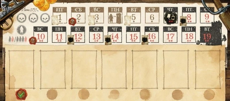 В начале хода каждого игрока его жетон перемещается по календарю и, если есть — выполняется действие Сильвера, например, оглашение новой подсказки.
