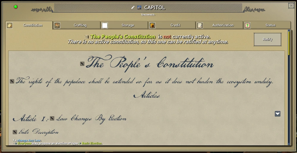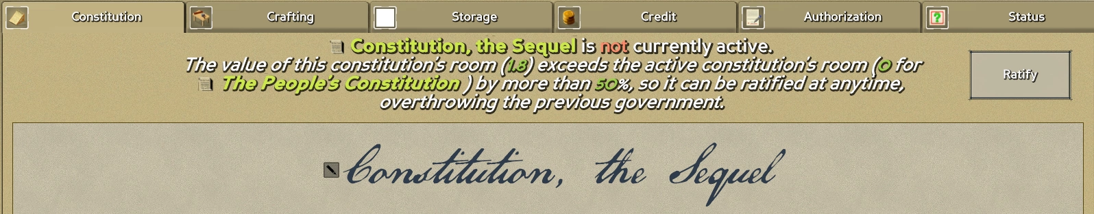В 9.0 до ратификации Конституции правительство попросту не существует — чтобы оно появилось, нужно опубликовать этот документ, который и будет определять, как это самое правительство работает. Таким образом, игроки не только создают правительство, но и формируют его особенности.