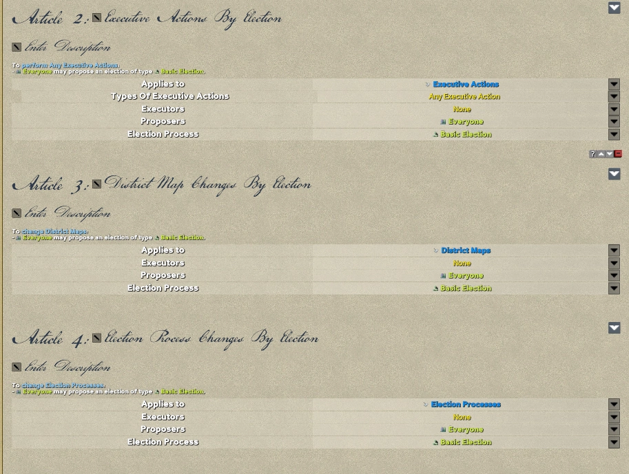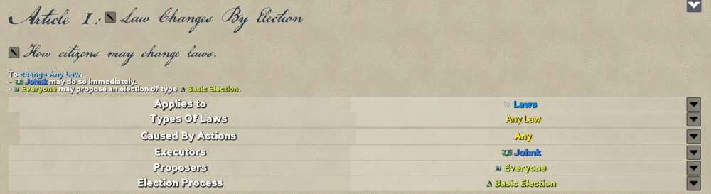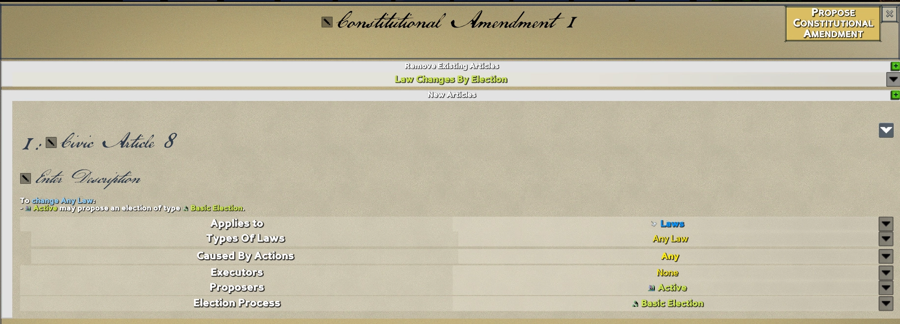 Эта поправка аннулирует статью Law Changes By Election, которую я показывал ранее, заменяя её новой, в которой нет должности Executor, а значит — законы смогут приниматься только в процессе голосования. Кроме того, изменения коснулись того, кто может запускать голосование — теперь это не Everyone, а Active, подмножество часто играющих. Далее начинается голосование за поправку, и в случае успеха она заменяет собой старый вариант статьи, которая теперь выглядит следующим образом: