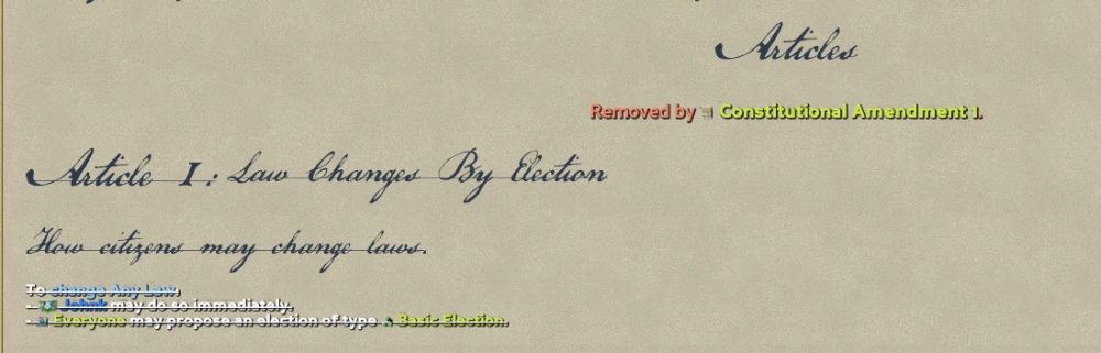 Статья никуда не исчезает, просто зачёркивается и перестаёт действовать. Если вдруг кому-то захочется откатить изменения, то можно будет вернуться к первоначальному варианту. Используя эти механики, граждане могут легко менять работу правительства в соответствии с изменениями в мире. Предвидеть сразу все сложности, с которыми можно столкнуться в процессе игры — довольно проблематично, намного проще постепенно принимать и менять уже принятые решения, адаптируя правительство к обстоятельствам.