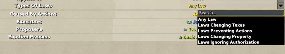 Конституция в Eco представляет собой набор пунктов, каждый из которых описывает какой-то аспект работы правительства. Например, на изображении выше показана статья, описывающая процесс принятия законов. Каждая строка, как вы видите, может быть изменена для максимально точного соответствия вашим чаяниям. Для начала — к чему применима эта статья (к законам, Laws), затем — как каким именно видам законов (Any Law), тут возможны следующие варианты: