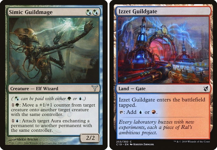 Я постановил, что в этом блоке мы будем в равной степени использовать все десять двухцветных вариантов, чтобы максимизировать простор для дизайнерских задумок. Brady Dommermuth из креативного отдела взял эту идею, поработал над ней и вернулся с концепцией гильдий, которая, в свою очередь, стала фундаментом для реализации «мира-города». Гильдии мне очень понравились, и после недолгих раздумий я решил разделить их на три части, 4-3-3, так, чтобы каждая гильдия появлялась в определённом наборе блока.