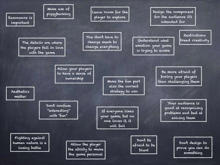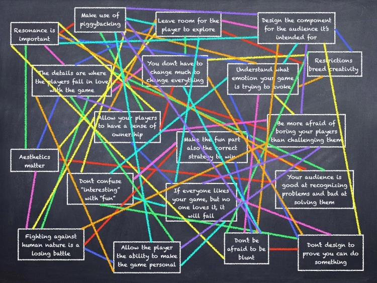 Присматриваясь к каждому уроку, я понял, что они сильно взаимосвязаны, то есть в результате получились не отдельные уроки, а единая сеть с массой соединений. Я даже подумывал переименовать доклад в «20 лет, одна очень сложная взаимосвязанная целостная система взглядов на геймдизайн», но решил, что это недостаточно броско выглядит (нормально выглядит, берём! — прим. пер).