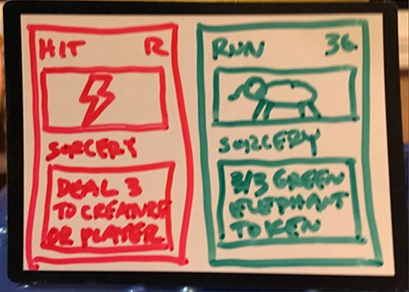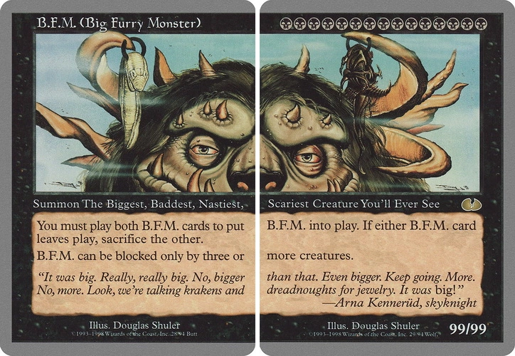 Название этой карты — B.F.M, Big Furry Monster (Б. М. М. — Большой Мохнатый Монстрюга — прим. пер.), и он такой огромный, что, как видите, не помещается на одной карте. Для того, чтобы его призвать, вам нужно иметь в руке обе карты — после чего выложить их на стол, соединив в одно гигантское существо. Годом позже, когда я работал над Unglued 2 (набором, который так и не будет выпущен), я задумался — если игрокам понравился монстр, состоящий из двух карт, то почему бы не пойти в обратном направлении и не сделать карту, на которой помещались бы сразу два заклинания? Я назвал это «сплит-картами».