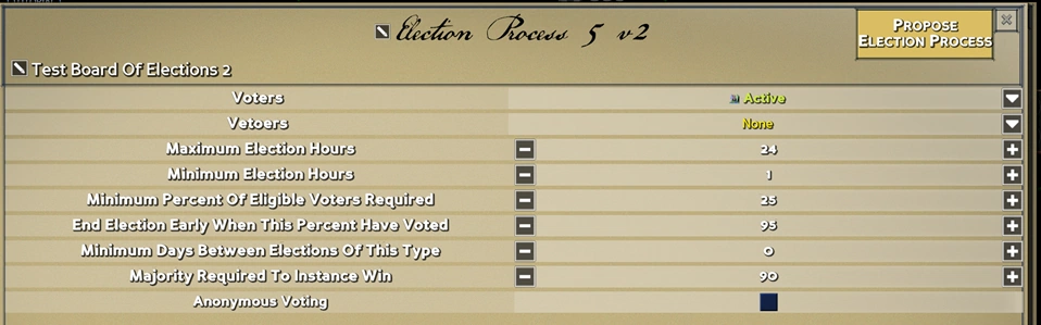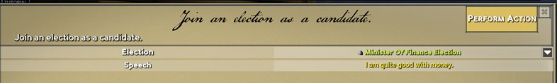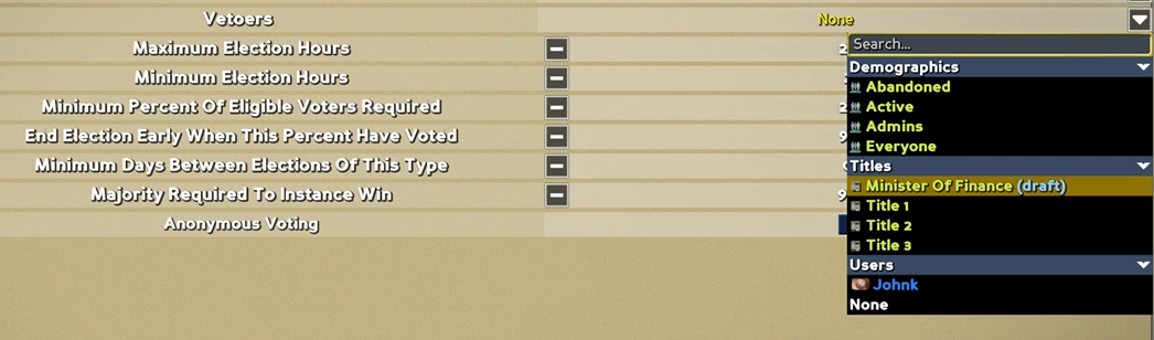 Выборные должности могут быть использованы в различных объектах таким же образом, как и отдельные игроки. Например, вернёмся к процессу голосования, который мы рассматривали ранее, и добавим в него возможность наложения вето министром финансов: