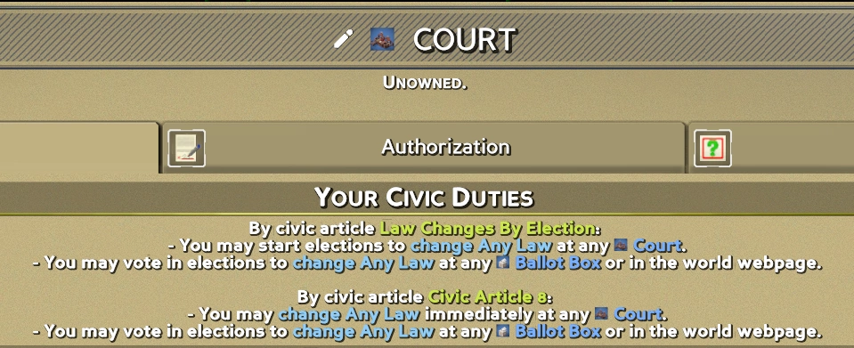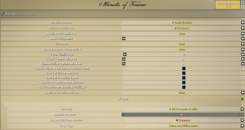 До версии 9.0 существовала всего одна должность, за которую все вели сражения — роль лидера мира, концентрировавшая огромную власть в одних руках. Это было не очень-то гибко и легко приводило к кризису, если лидер мира начинал вредничать или покидал сервер. Теперь же вы сможете создавать много управленческих должностей и разделять между ними правительственные полномочия разными способами. Чтобы добавить новую выборную должность, нужно создать её в Офисе Правительства: