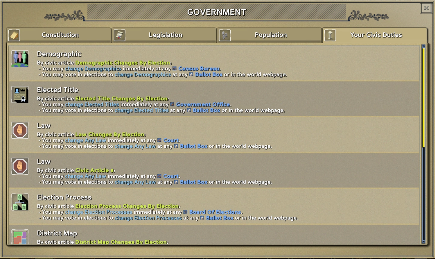 Каждая должность обладает широким набором изменяемых свойств, позволяющим точно настроить её функции и получаемые привелегии. В числе прочего, вы можете изменить и процесс голосования за лидера мира, определить, кому можно будет выдвигаться на этот пост и т. д. Должности могут заниматься несколькими игроками.