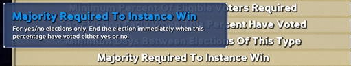 Разные виды голосований позволяют делать всякие крутые штуки, вроде многоуровневых правительств и выборных представителей, способных голосовать за законы. Вы сможете создавать системы сдержек в виде различных форм вето, определять, как долго будут проходить голосования — в общем, всячески адаптировать систему управления к новым обстоятельствам.