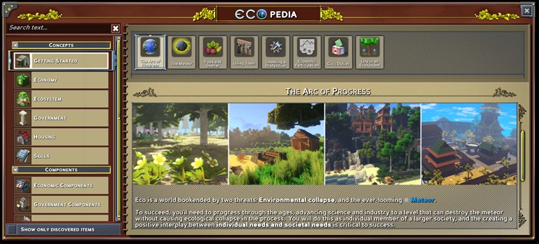 Благодаря Экопедии, стало гораздо проще разобраться в механиках Eco, особенно — в тех нововведениях, которые появятся в обновлении 9.0. Во время Раннего Доступа мы получили много обратной связи относительно кривой обучения — и сделали большой шаг в сторону облегчения понимания, как взаимосвязаны системы Eco, как пользоваться ими и достичь с помощью этого успеха. Это также создаёт задел на будущее — когда мы добавим ещё более разнообразные механики, и для владельцев кастомных серверов тоже — позволяя легко объяснить игрокам изменения, которые они внесли.