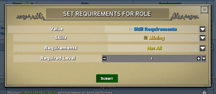 До публикации можно настроить все параметры. В данном примере я выбрал «автоматически увеличивать количество слотов для работников», а значит, по мере присоединения к контракту людей, будут появляться места для новых. Можно установить специальные фиксированные слоты для определённых участников. Например, добавим слот для работника, у которого прокачан навык горного дела и выдадим ему соответствующее профессии задание: