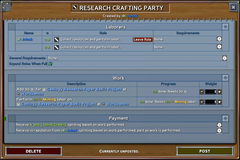 Одна из главных целей, которых мы хотим достичь при дизайне экономики в Eco — чтобы в ней были одинаково востребованы как товары, так и услуги. Из этого следует, что рынок труда должен быть легко доступен, супер-полезен для достижения успеха в игре и участвовать в нём должно быть интересно. Задания, публикуемые для выполнения — как квесты, но, в отличие, от других игр, они не являются чем-то искусственным (добавленным вручную разработчиком), а напротив — создаются такими же игроками, как вы, и отражают реальные их потребности.