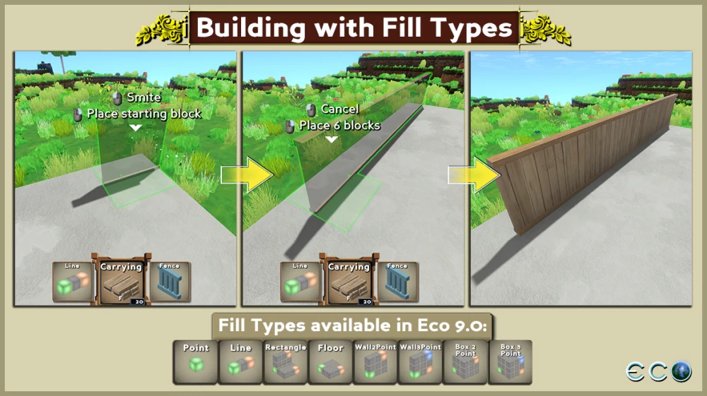 Виды заполнения — первый шаг к созданию более мощной системы расположения строительных блоков. До Eco 9.0 игрокам приходилось выкладывать их по одному. Теперь же, с помощью видов заполнения, игроки смогут строить крупные здания, размещая одновременно целые ряды блоков. Сейчас на этот процесс распространяются ограничения переносимого игроком количества материалов, поэтому максимумом является 20 блоков за раз. Однако, в будущем мы планируем ввести ещё более мощные строительные инструменты, у которых подобных ограничений не будет и которые даже позволят переключаться между различными материалами на ходу.