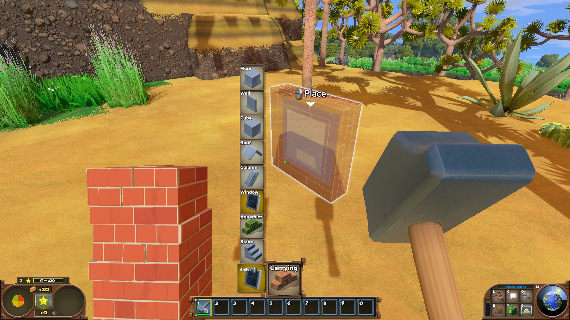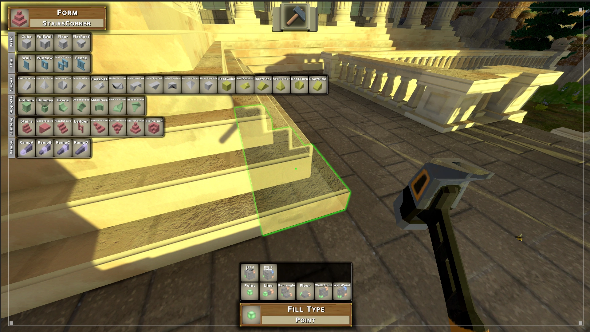 Первое нововведение, о котором мне хочется рассказать — это новая механика молотка, называемая «вид заполнения». Как вы можете видеть, у видов заполнения есть отдельная секция в интерфейсе выбора строительного элемента. Виды заполнения позволяют игрокам определять стартовую и конечную точку больших строительных форм — а все недостающие блоки подставляются автоматически. Например, чтобы построить длинный прямой забор, достаточно выбрать элемент «ограждение» и затем вид заполнения «прямая» — после чего достаточно щелчком правой кнопки мыши разместить начальную точку, и вторым — конечную. Вуаля — забор готов!