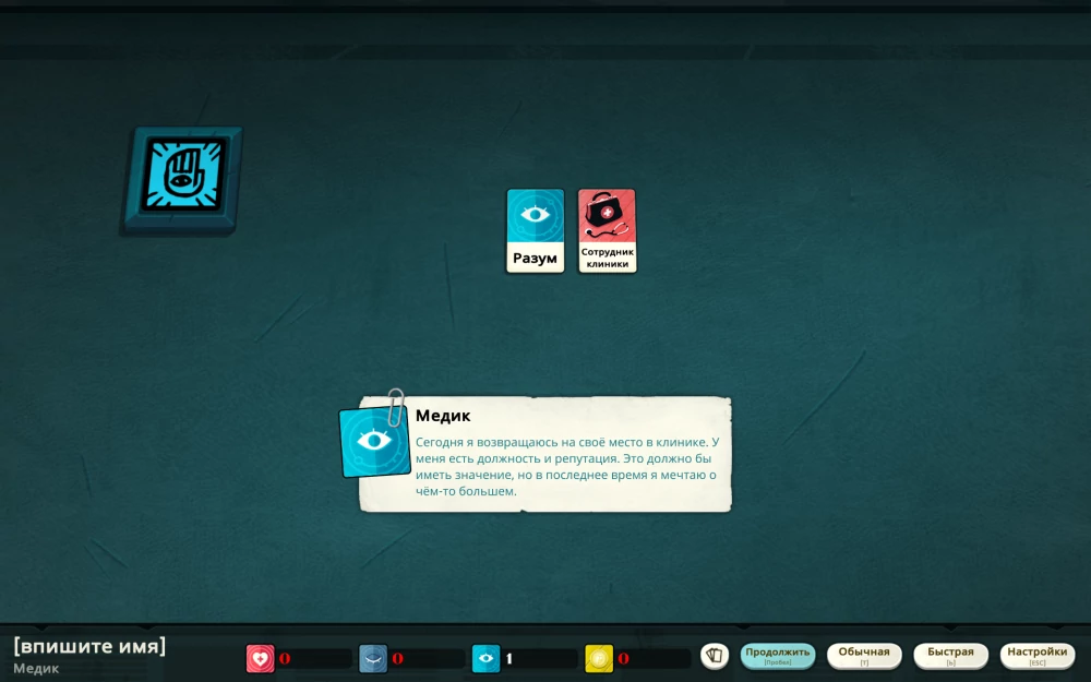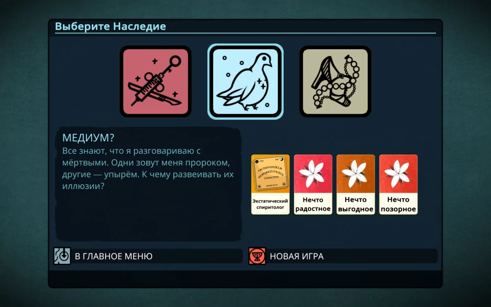 НО! На этом прискорбном событии игра вовсе не заканчивается, а скорее напротив — если вы достигли определённых высот в оккультном мастерстве, вам посмертно выдадут плюшек и предложат продолжить. Как именно продолжить, выбирать вам — будет ли вашим новым альтер-эго врач, наслушавшийся предсмертного бреда очередного пациента, или медиум, в стандартный протокол спиритического сеанса которого ворвался ваш дух, поведав неземное, либо совсем посторонный персонаж. Важно то, что прогресс не обнуляется до конца, а история — продолжается.