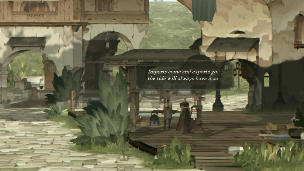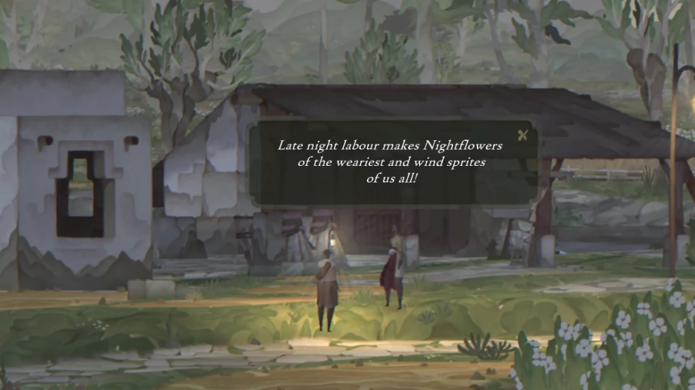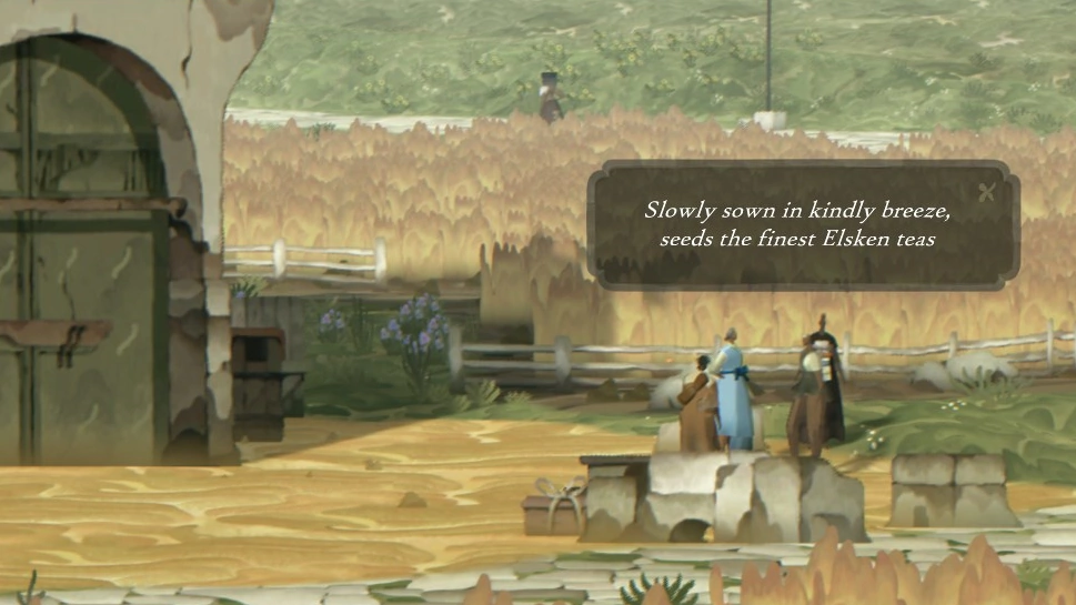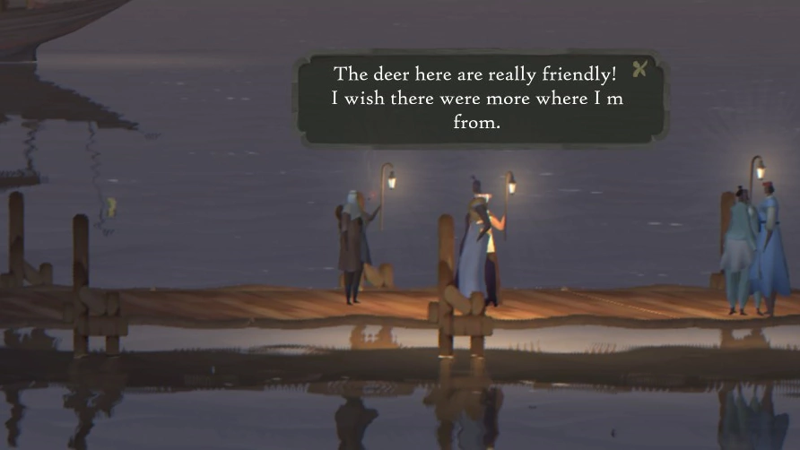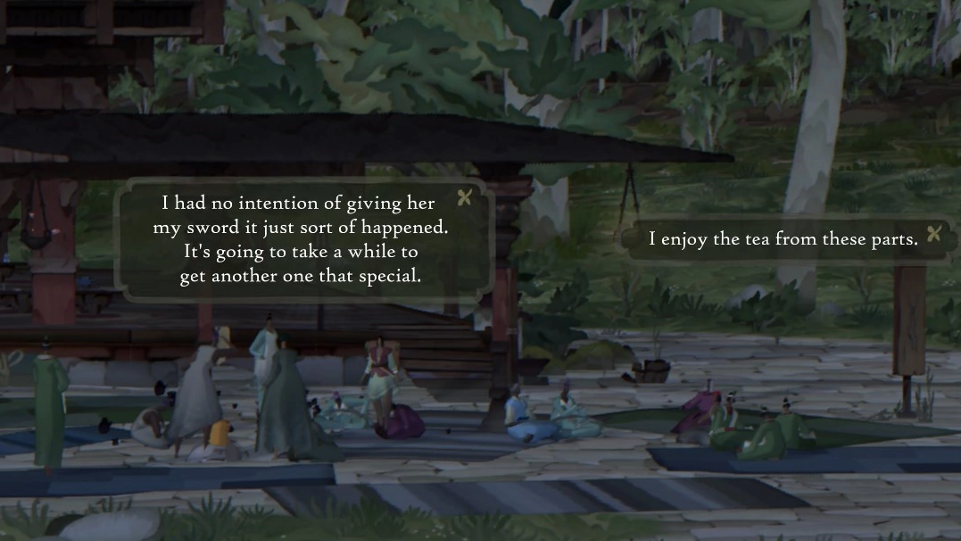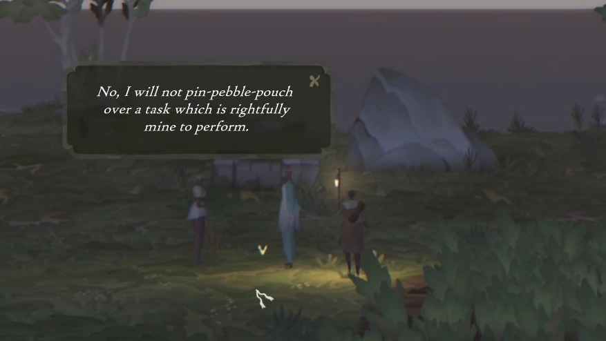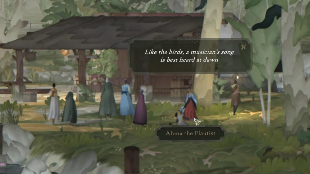 Одним из основных различий между Book of Travels и обычными RPG является то, что вы не можете поговорить с NPC, которых встретите на своём пути. Нам совсем не сложно было принять такое решение, потому что мы давно чувствовали (и игроки тоже, по нашему мнению) усталость и разочарование от однотипных, заскриптованных диалогов с NPC — и увидели прекрасную возможность это изменить, сделав по-другому. На Плетёном Берегу NPC разговаривают повторяющимися рифмованными строками — выполняя свою функцию обогащения лора и формирования мира, но поскольку они не поддерживают беседу, то выглядят скорее как персонажи из книжки, чем как чатботы. Мы надеемся, что, создавая их таким образом, мы предоставим игрокам менее утомительный и более захватывающий опыт, поддерживаемый остальными элементами, вроде всплывающих окон, оформленных в «бумажном» стиле и двухмерной графики, которые позволяют почувствовать Book of Travels очень подходящим местом для встречи с текстом таким вот, «книжным» способом. На мой взгляд, стихотворные строки отлично сочетаются с двухмерными пейзажами Плетёного Берега, добавляя миру, по которому вы путешествуете, атмосферных деталей и глубины.