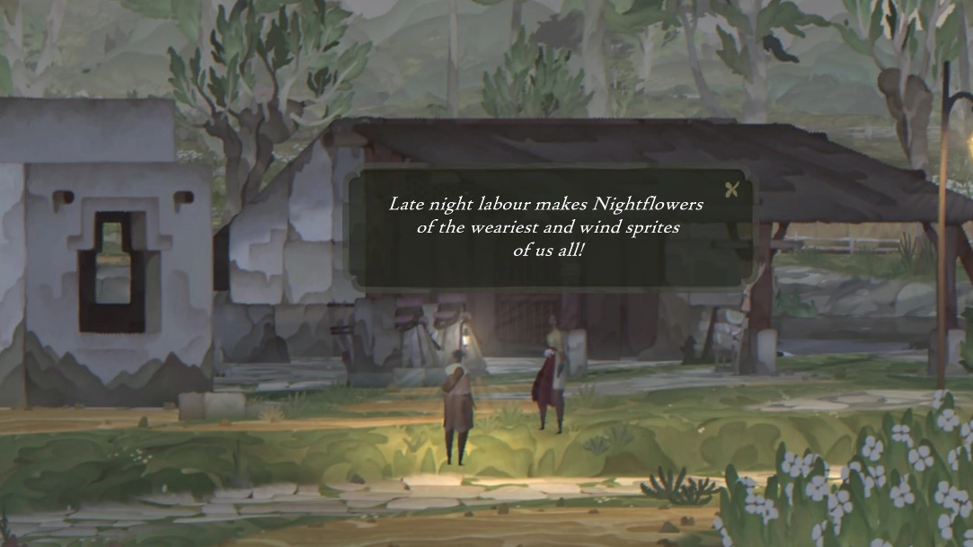 Написание диалогов для NPC — это очевидная возможность обогатить альбом со сказками эстетикой игрового мира. Стиль и тон, которого мы надеемся достичь — это смесь из народной мудрости, оптимистичной болтовни и прихотливого лора. У каждого класса персонажей есть набор «черт», каждая из которых призвана приоткрыть их роль в мире, наряду с оттенком личного мироощущения. Их мы тоже сделали «поэтически» — некоторые используют римфы, другие — фонетические или ритмические паттерны. Целью этого является усиление впечатления того, что вы находитесь внутри книжки с картинками, но, в то же время, чтобы истории не были одноразовыми. Иногда игроки могут столкнуться с диалогами, содержащими нечто менее обычное — кусочки историй или информации. Мы хотим, чтобы в таких случаях они были менее «двухмерными», написанными в более персональном и прямом виде, сигнализируя о том, что вы столкнулись с чем-то, находящимся за пределами «сценария» и ритма повседневной жизни. С приключением, если хотите!