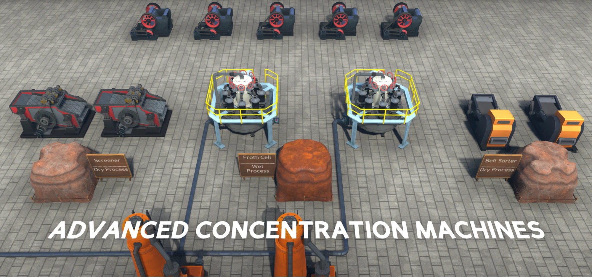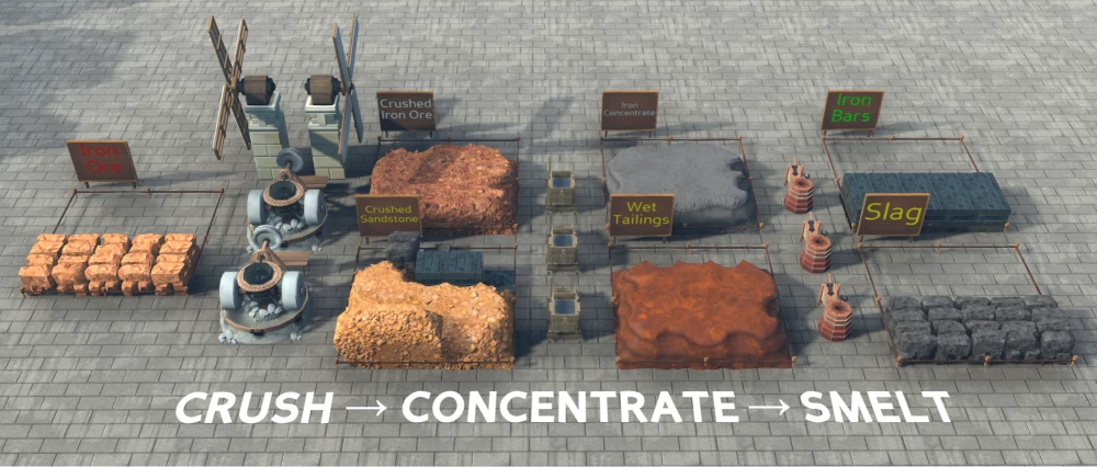 Самое большое отличие от предыдущих версий заключается в том, что теперь для переработки руды игрокам потребуется сначала её измельчить, затем обогатить для получения рудного концентрата — и только потом из него можно будет что-то выплавить. Для новых процессов существует набор станков, которые могут быть использованы для соответствующих стадий переработки. На следующем скриншоте представлена вся последовательность переработки железной руды, добытой в шахте, с побочными продуктами и результирующими материалами на начальном этапе игры: