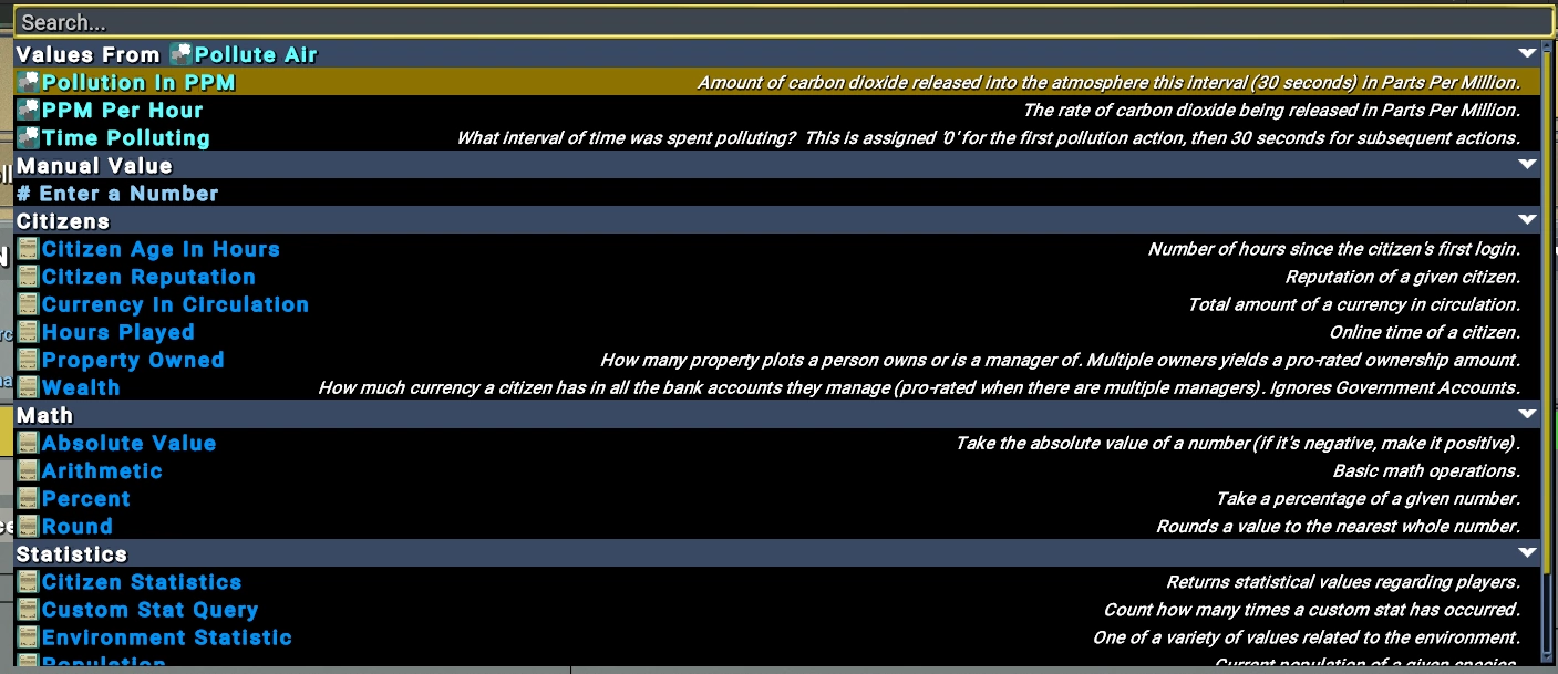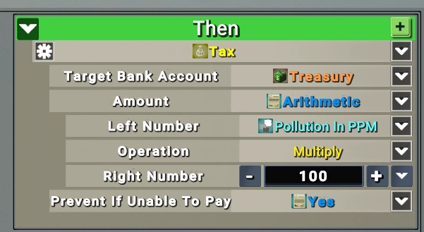 Сделаем размер налога напрямую зависящим от размера загрязнения. Это только один из вариантов, как видите — в выпадающем меню есть огромное количество других видов вычислений: