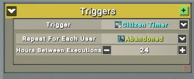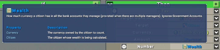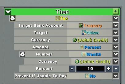 В нашем случае этот закон будет действовать для участникоа демографической группы «Abandoned» каждые 24 часа. В качестве действия мы можем установить налог, зависящий от благосостояния каждого конкретного игрока: