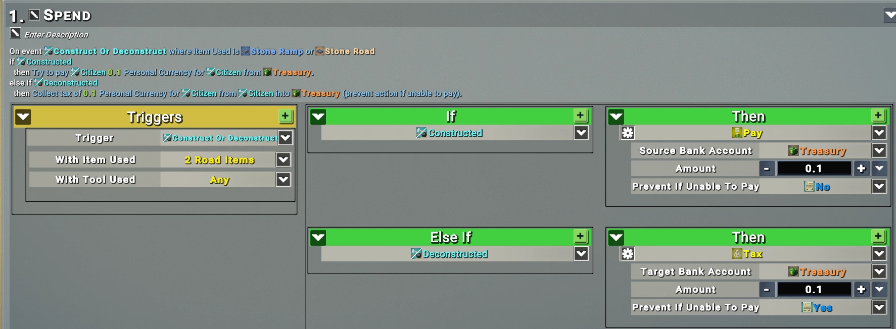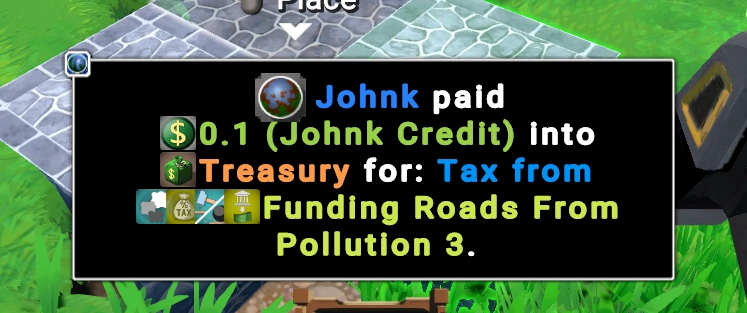Мы детектируем создание дорожного блока и начисляем игроку, совершившему это действие, бонус из казны. Чтобы соблюсти баланс, добавляем обратный случай — при разрушении дороги вы получаете штраф. Таким образом, мы стимулируем игроков строить дороги, не давая им абузить закон, раз за разом ставя и тут же разрушая дорогу.