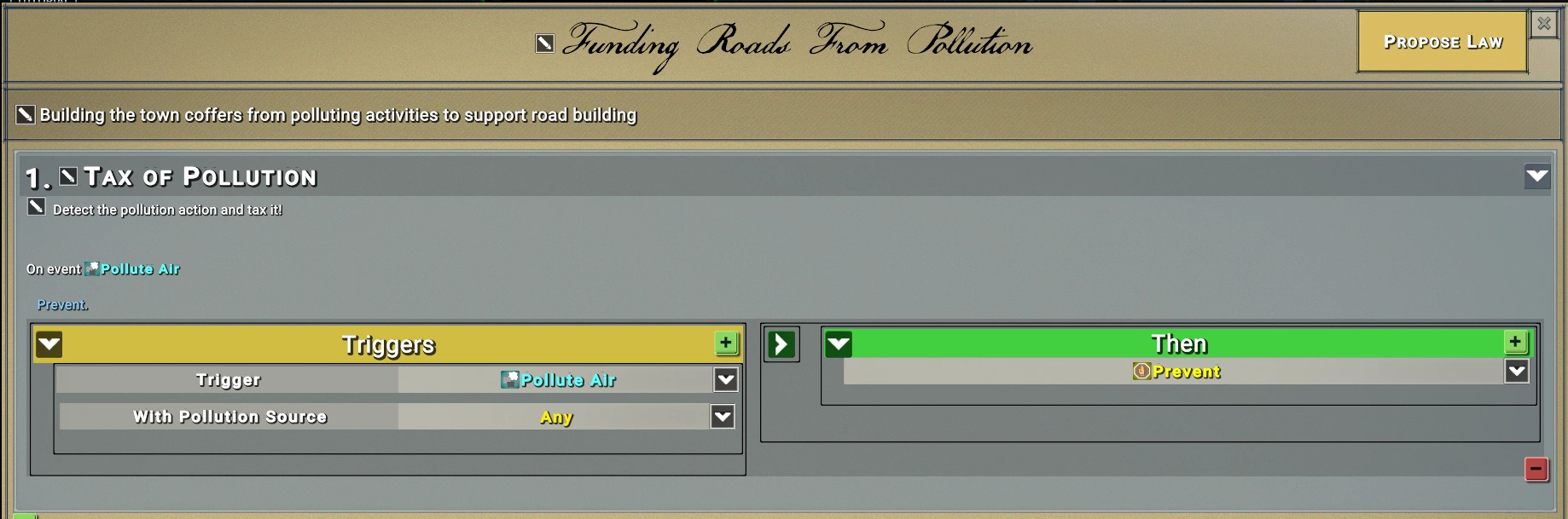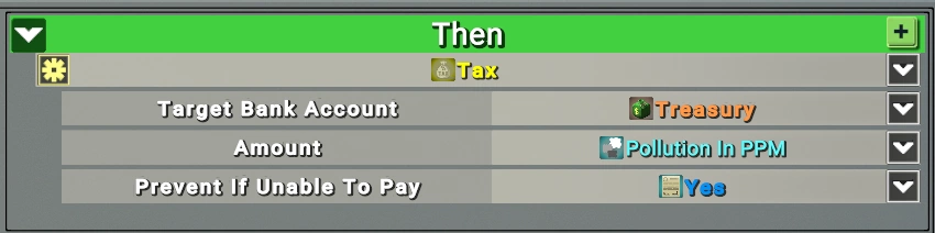 Одно из действий внутри игры, которое можно выполнить в процессе срабатывания закона — это денежный перевод, с помощью которого можно обложить что-то налогом или, напротив, дотацией (для стимулирования чего-либо). Давайте создадим закон, делающий и то, и другое. Пусть закон срабатывает при каком-нибудь негативном событии, например — загрязнении воздуха, и взимает за это налог: