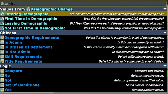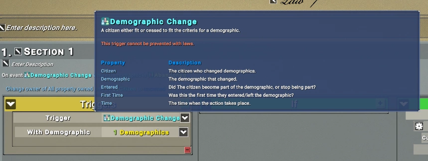 С помощью законов в 9.0 вы сможете менять владельца клаймов. Можно, например, создать закон, который в тандеме с новыми демографическими механиками (смотри соответствующий блог) позволит возвращать заброшенные игроками участки в общее пользование. В качестве триггера в этом случае мы используем факт перехода игрока в демографическую группу «Abandoned»: