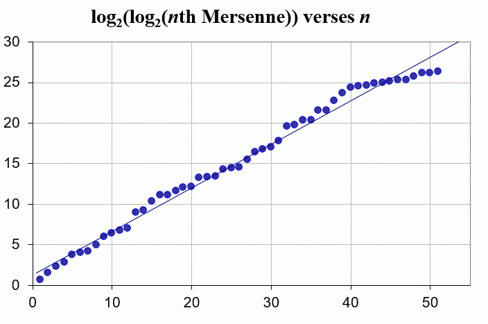 Интересна сложившаяся ситуация тем, что, по идее, следующее ПЧМ должно было быть найдено задолго до этой юбилейной отметки. Я намеренно использовал здесь не вполне подходящий термин «должно», потому что на самом деле — никто не знает точного принципа распределения простых чисел Мерсенна, мы можем оперировать лишь вероятностями и эмпирическими графиками, основанными на предыдущем опыте, вроде вот такого: