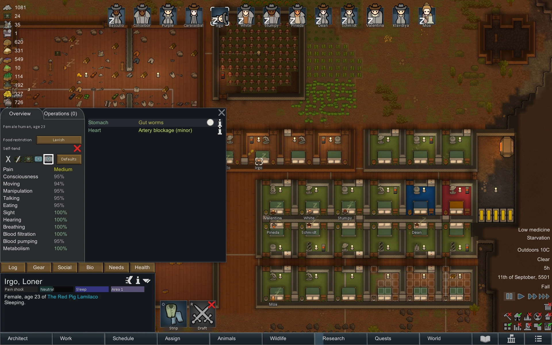 Думаю, что читавшие мои предыдущие рассказы товарищи уже начали хитро улыбаться, предвидя концовку. Да, вы абсолютно правы, уважаемые товарищи. В очередной раз я порадовался, насколько мало в RimWorld ханжества и запретов — и просто-напросто накачал Irgo сначала одним, потом другим (чтобы не вызывать привыкания), затем опять первым… до того самого момента, как хворь известным образом не покинула моего красноглазого и постоянно шмыгающего носом учёного.