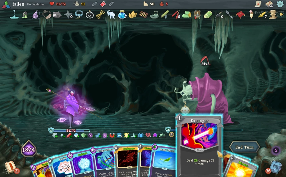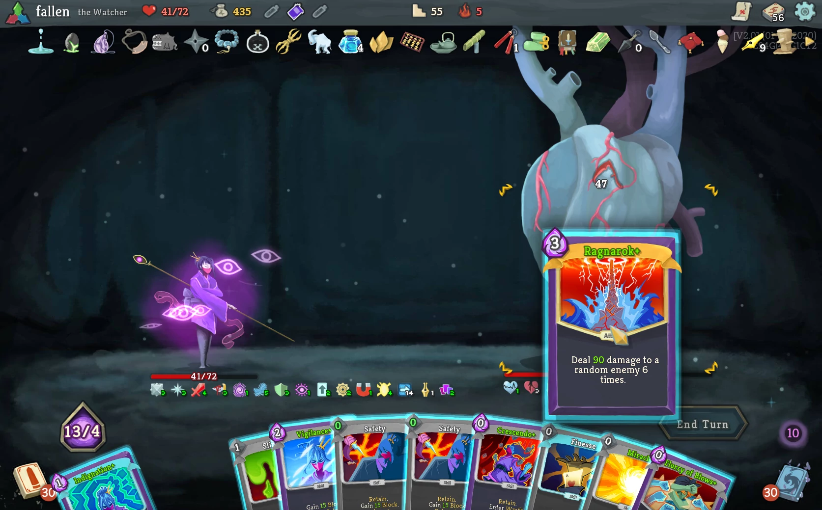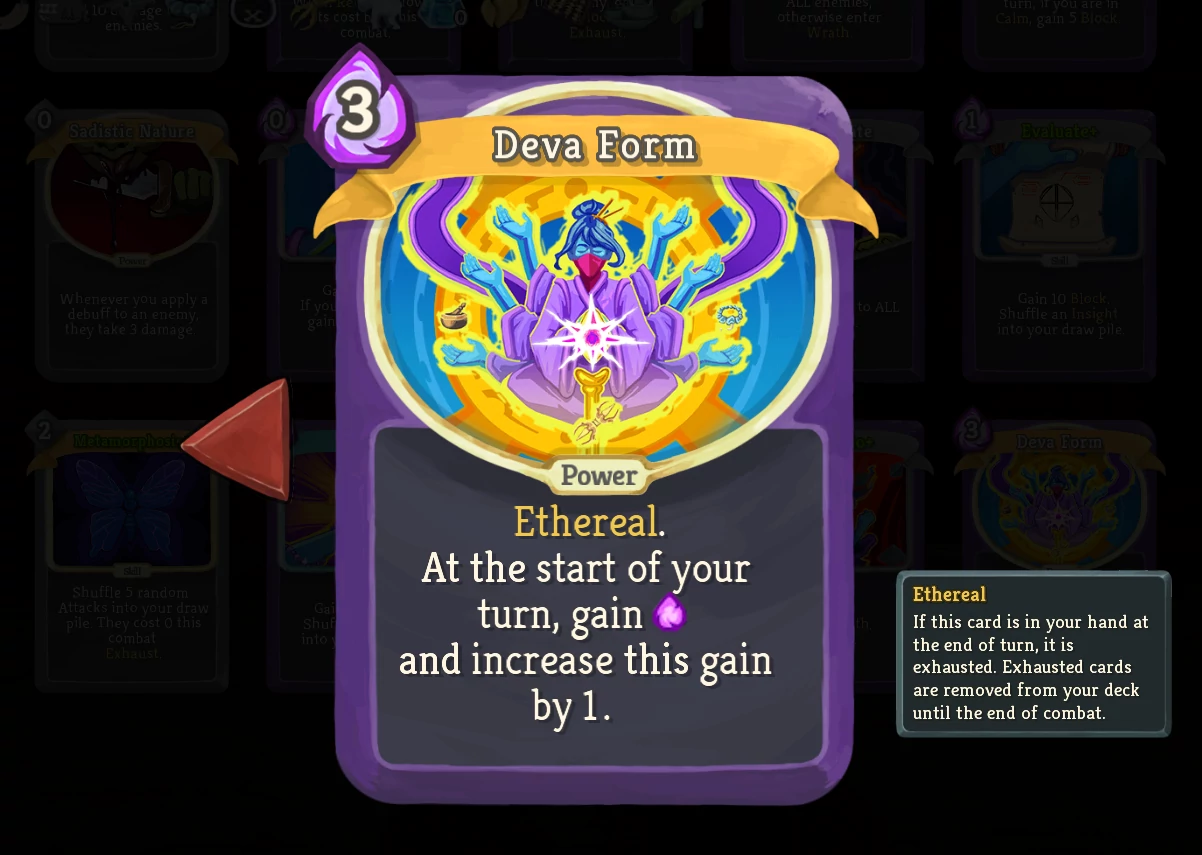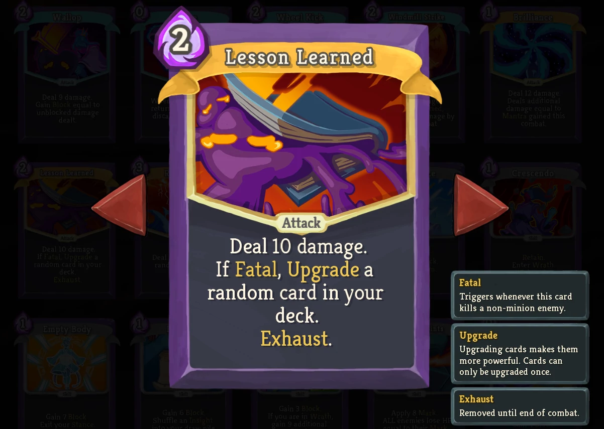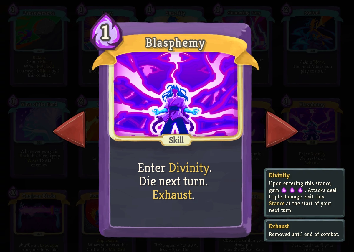 С первыми двумя стойками, смею надеяться, всё более-менее понятно. Спокойствие - хорошо пригодно для отложенных действий, набора дополнительных очков энергии, бонусных карт. Гнев - для дерзкого кавалерийского наскока, нанесения огромных цифр урона, с последующим, если не удалось заколупать противника, уходом в защиту - ну или набором достаточного количества блока, чтобы перетерпеть двойной дамаг.