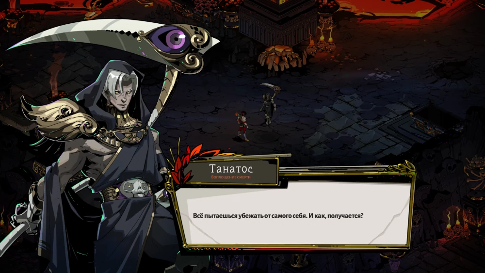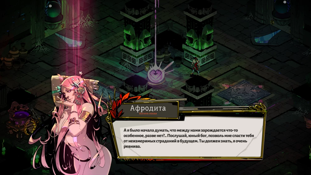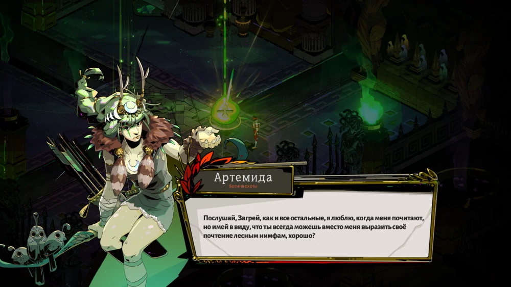 Настигнет - и вы вернётесь домой, раздражённо фыркая и отряхиваясь от багровой жидкости, выходя из бассейна. "Умрёшь, начнёшь опять сначала..." - ну, вы поняли. Получив дежурную шпильку от встречающего всех на сём скорбном пути Гипноса и критическое замечание от Аида, мы вольны идти, куда захотим (в начале игры, впрочем, открыто далеко не всё) - хоть к наставнику Ахиллесу, хоть к клининг-менеджеру Дузе, а то и Цербера почесать. Каждый персонаж относится к вам по-разному, но объединяет их одно - получив в подарок бутылочку запрещённого вообще-то в подземном царстве нектара, они добреют и в качестве компенсации выдают вам разного рода безделушки - артефакты с пассивным свойством, один из которых можно взять с собой при очередном побеге. Видите, ещё одна возможность для кастомизации.