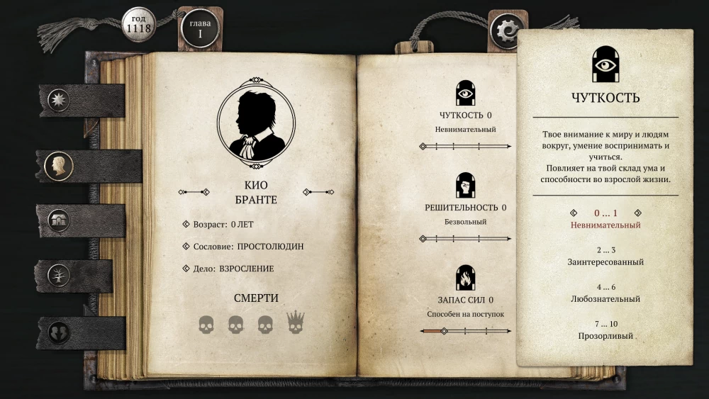 Но вернёмся непосредственно к игре. Её хронология представляет собой несколько этапов, в течение которых главный герой постепенно взрослеет. Родившись на свет, наш Бранте не обладает никакими навыками, но по ходу дела, совершая различные поступки, он ими овладевает, а какими именно - зависит от вас, и в этом-то, собственно, и заключается весь процесс. Условно, в первой главе вы можете стать непоседливым карапузом или тихим и внимательным карапузом. Чуть повзрослев, набор навыков увеличится, унаследовав черты из предыдущего этапа. И так несколько раз, в результате сформировав взрослого человека с некоторым набором склонностей.