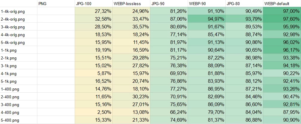 Даже старичок JPEG показывает 70-80% экономии относительно PNG, а WebP, при "более лучшем" качестве картинки идёт ещё дальше - показывая от 80% у небольших картинок до 90% у полноразмерных. Иначе говоря - размер получившихся файлов в 5-10 раз меньше оригиналов. Можно было бы на этом закончить - но мятежная душа исследователя погнала меня за буйки.