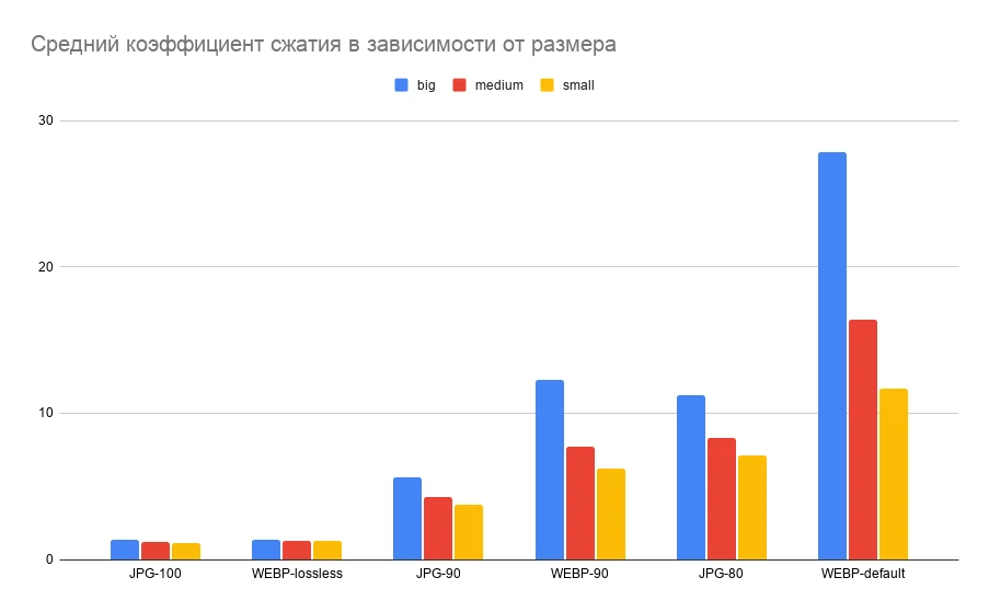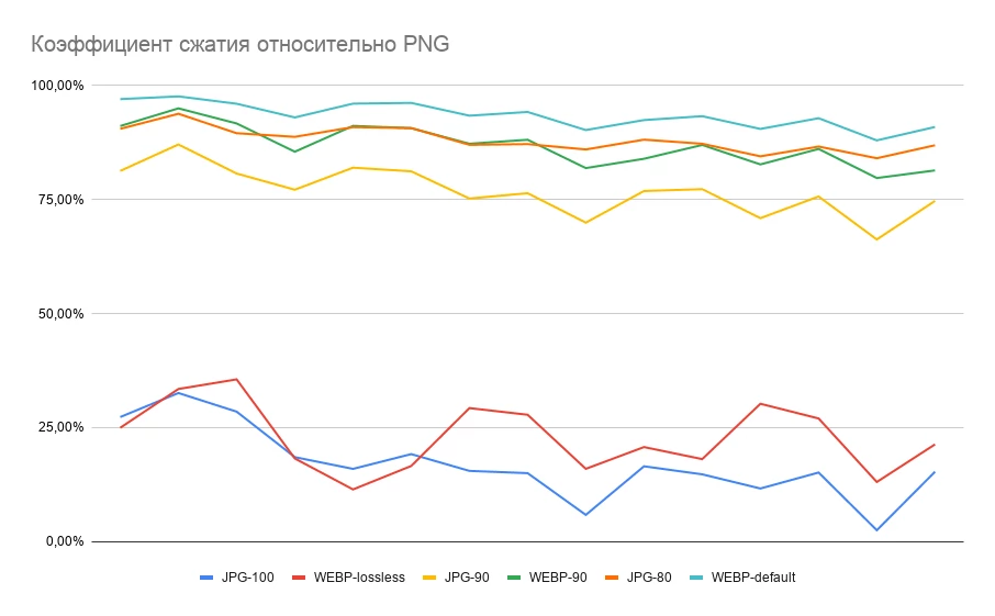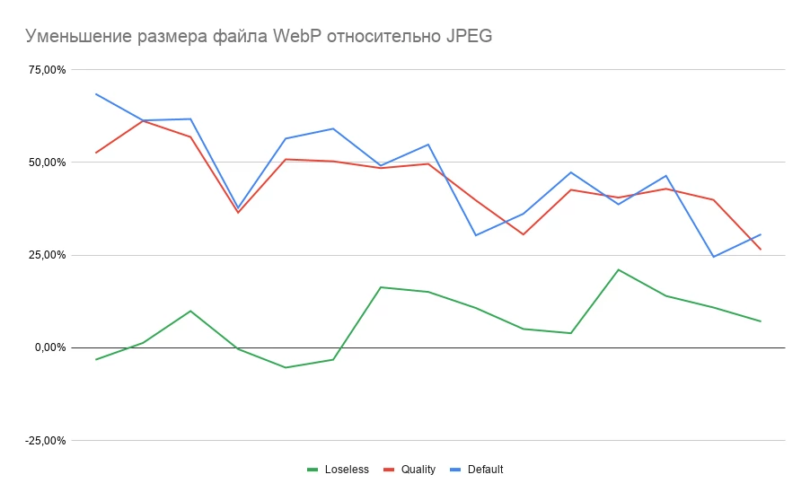 В режиме Lossless этого практически не видно, но во всех остальных случаях, если сравнивать только JPEG vs WebP, размер файла последнего в среднем в полтора-два раза меньше: