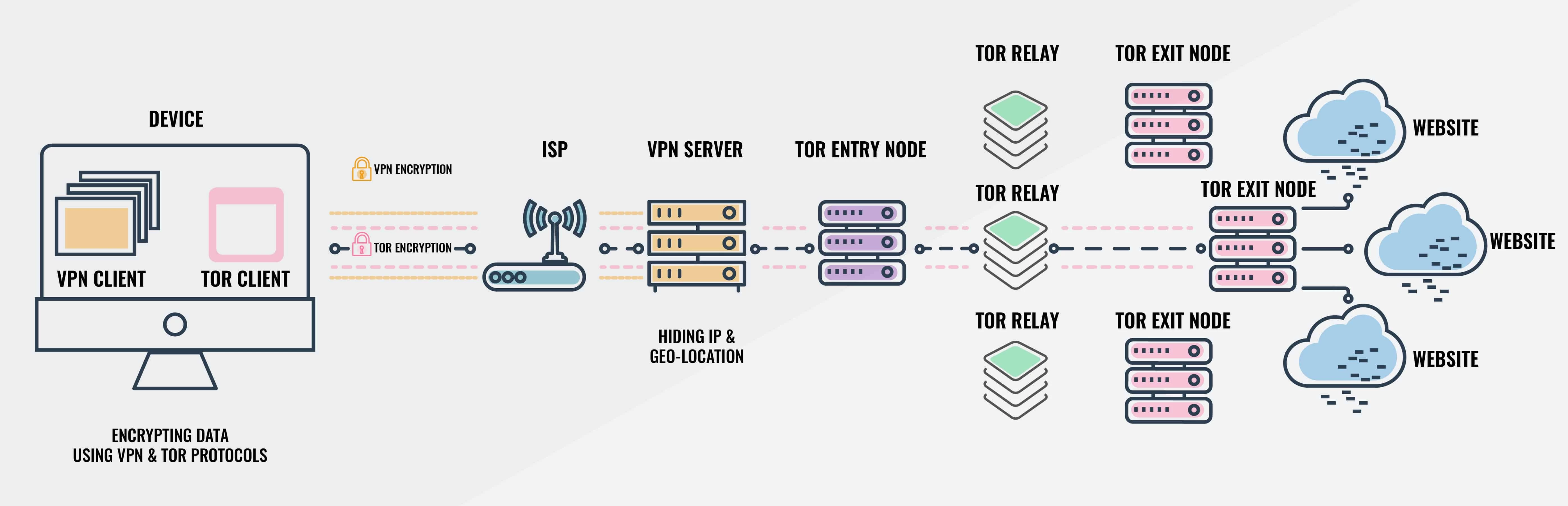 Например, вы хотите зайти на приснопамятный сайт некололи.ком через Тор. Для этого вы случайным образом выбираете три ноды из нескольких тысяч доступных - одна из них используется как входная (entry guard), вторая - промежуточная (middle relay), третья - как выходная (exit node). У вас есть публичные ключи всех трёх нод, а следовательно - вы можете зашифровать данные так, чтобы расшифровать их могла только соответствующая нода. Тогда последовательность действий будет выглядеть следующим образом: