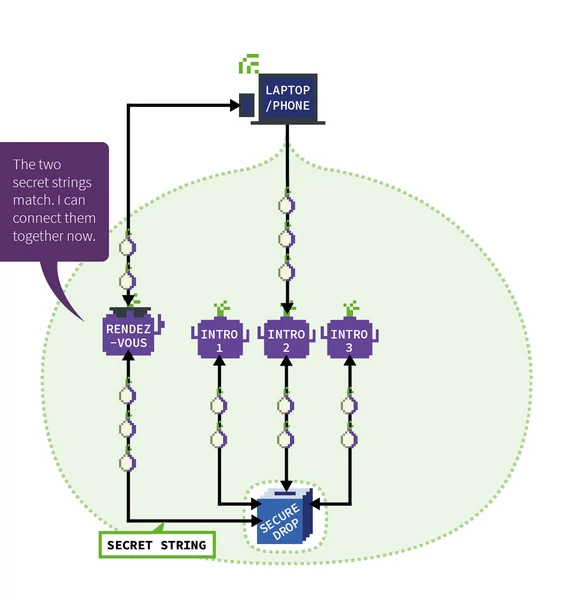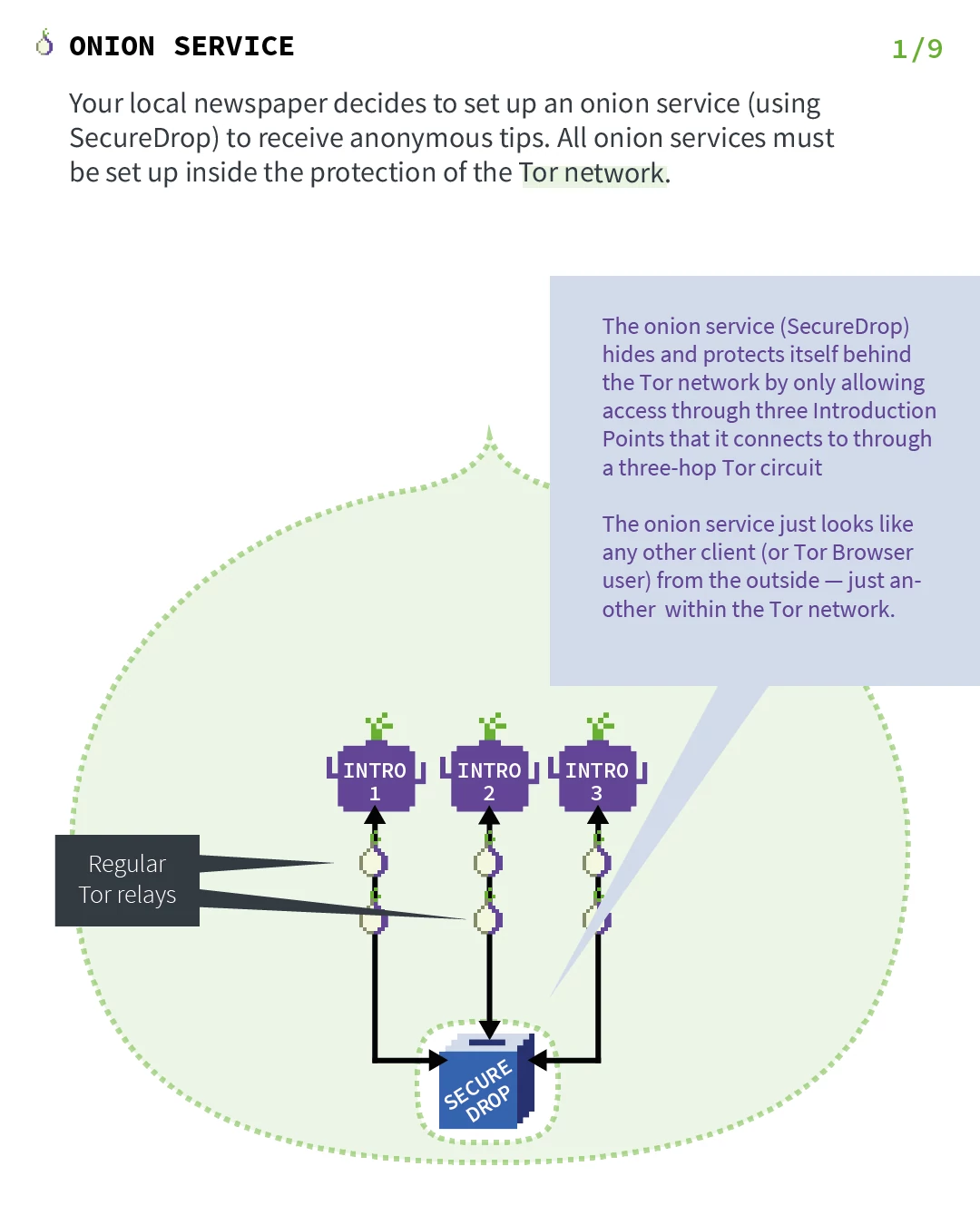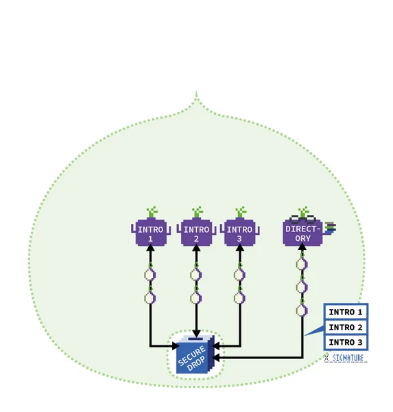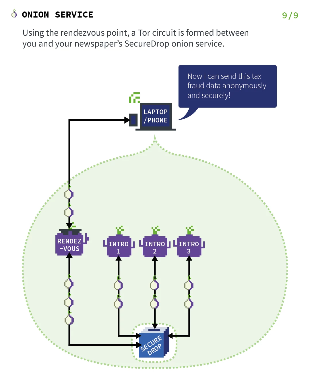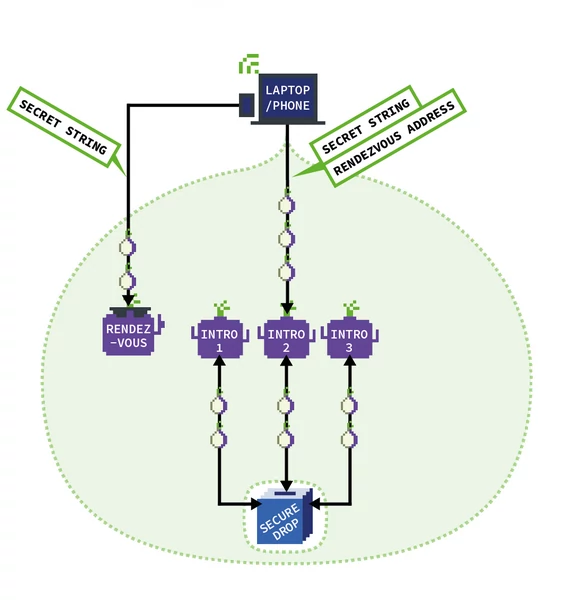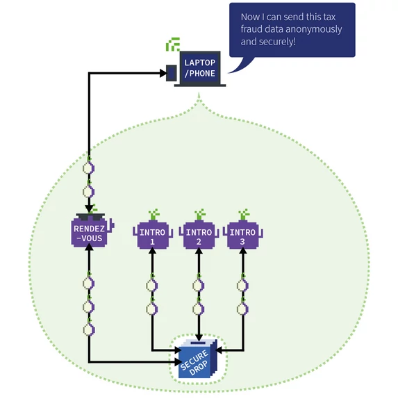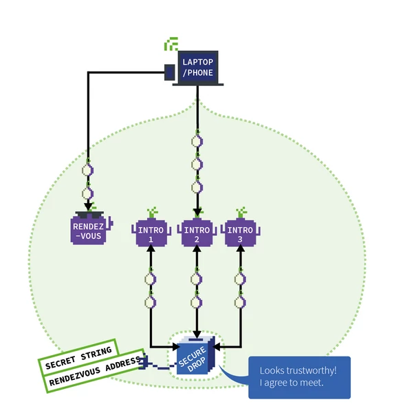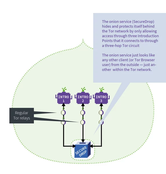 Итак, у нас есть некий onion-сервис, отмеченный на картинке синим квадратиком SecureDrop. Чтобы желающие могли попасть на этот сайт, происходит следующая последовательность действий: