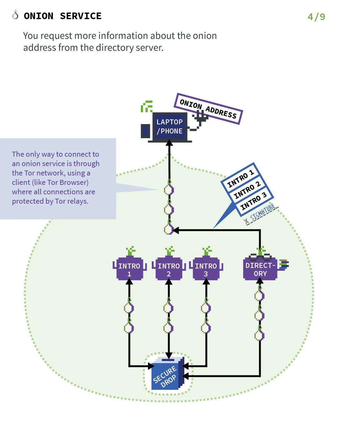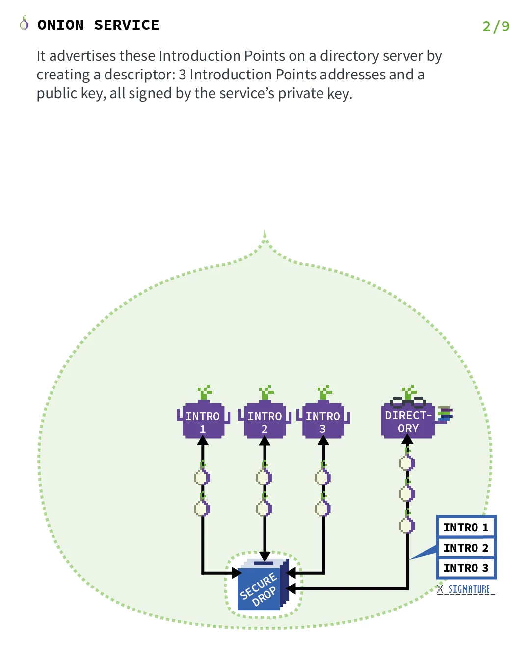 Получив в своё распоряжение три анонсирующих точки, сервис составляет т. н. дескриптор onion-сервиса, включающий в себя координаты анонсирующих нод, подписанные приватным ключом сервиса, после чего публикует этот дескриптор (тоже через анонимный защищённый канал) в распределённую хэш-таблицу (directory), являющуюся частью инфраструктуры сети Tor и доступную всем участникам.