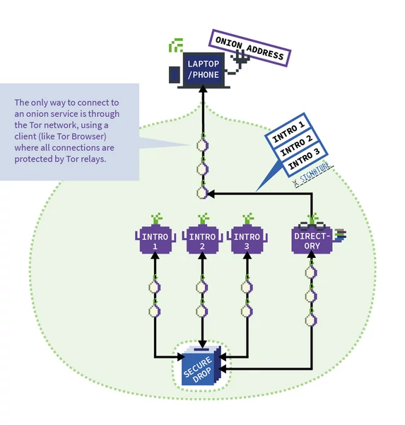 Клиент, желающий воспользоваться сервисом, должен знать наш onion-адрес - это довольно длинная последовательность символов, заканчивающаяся, как обычный домен, зоной - в данном случае .onion. Важный нюанс! Помимо наименования onion-адрес ещё и представляет собой публичный ключ, по подписи которого можно проверить дескриптор в хэш-таблице, что клиент и делает (опять же - через анонимный защищённый канал).