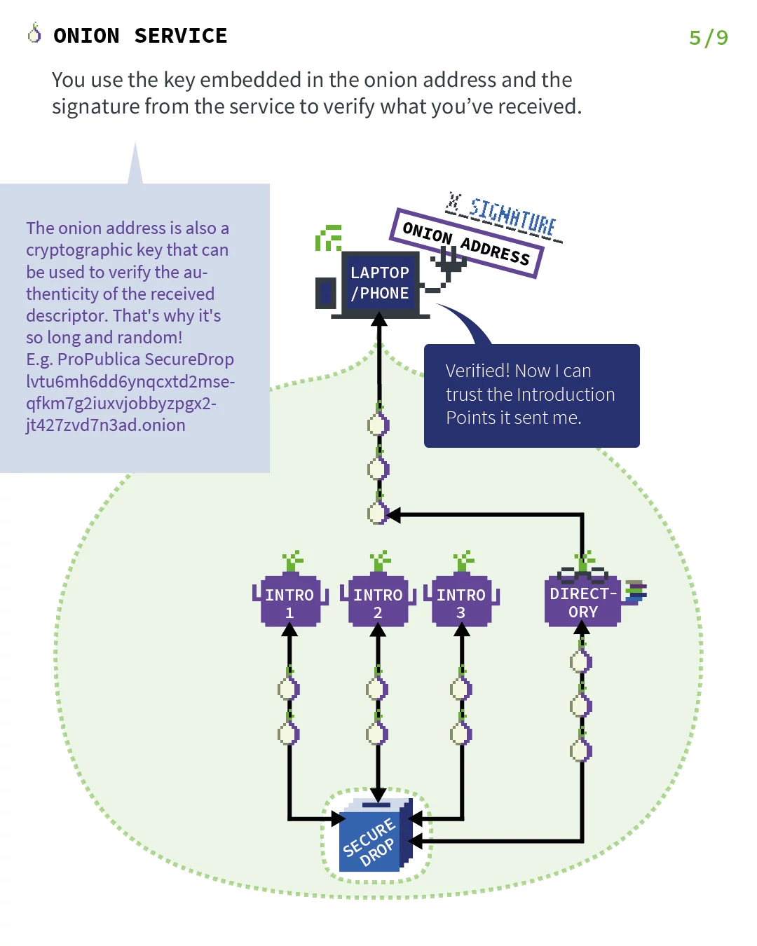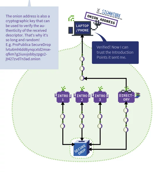 Получив дескриптор, клиент проверяет его, сравнивая подпись с onion-адресом, и в случае совпадения смотрит внутрь, находя адреса анонсирующих точек.