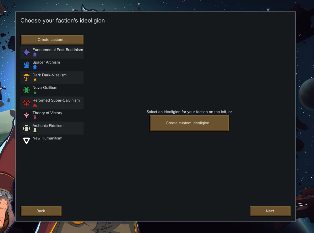 В Ideology при создании нового сценария нам предлагают выбрать себе идеологический конструкт, либо, засучив рукава, создать его самостоятельно. Идеология выстраивается способом "сверху вниз", начиная от так называемых мемов, представляющих собой идеи, лежащие в основе верования. Их количество варьируется от одного до четырёх, каждый из которых привносит собственные особенности и (куда без них?) ограничения.