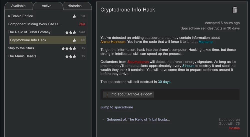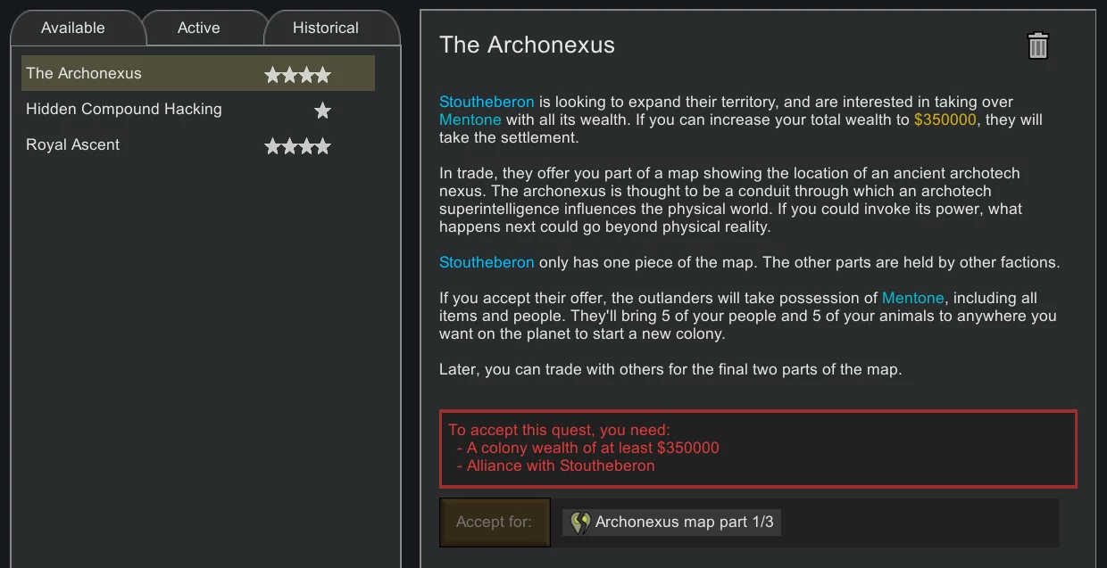К вариантам завершения сценария добавилась, если можно это так назвать, новая возможность - на определённом этапе одна из фракций предлагает вам следующее: вы развиваете колонию до того, что её рыночная стоимость достигает определённой суммы, после чего фракция приобретает её себе, а вас (нескольких избранных вами колонистов и животных) переселяет в другое место. Вдобавок, фракция отдаёт вам один из кусков древней карты, на которой отмечено расположение Древнего Храма Сверхразума. На новом месте вы, фактически, начинаете с начала - хоть и с гораздо более крутыми колонистами и технологиями. Останется где-то ещё добыть недостающие части карты - и сценарий будет пройден!
