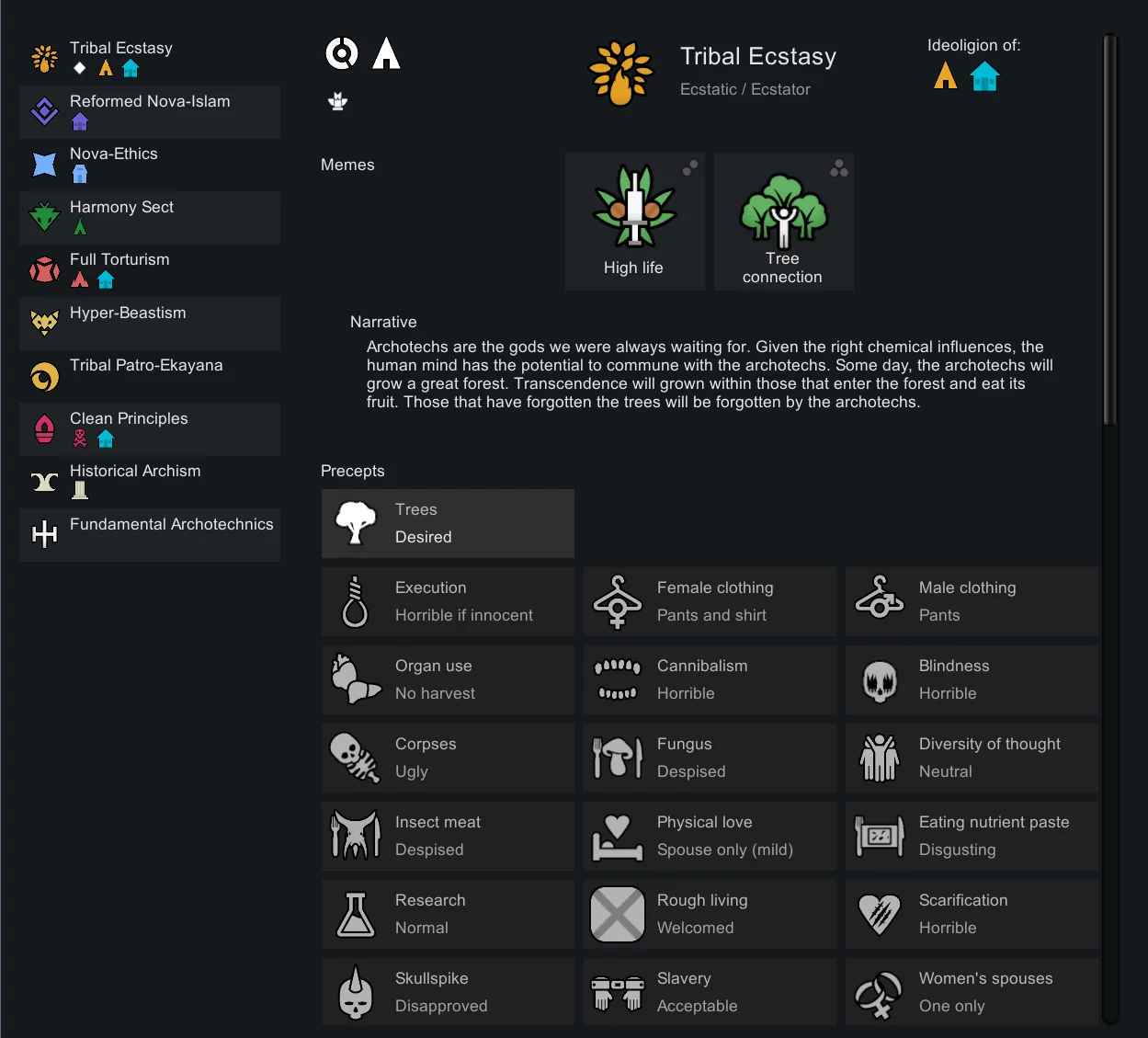 Взятие каждого мема добавляет в копилку идеологии несколько предписаний или, если хотите, заповедей. Они не залочены намертво, а варьируются от раза к разу - и так же, как с мемами, их можно изменить вручную. Заповеди характеризуют отношение участников идеологического эгрегора к самым разным сферам жизни - от романтических отношений и благотворительности до употребления в пищу мяса, от шрамирования и коллекционирования черепов - до "перемотки возраста назад" с помощью технологий.