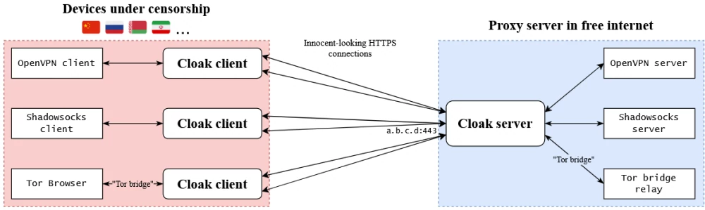 С точки зрения внешнего наблюдателя, передача данных с помощью Cloak не отличается от захода на обычный сайт. Внутри же может быть что угодно, как VPN-туннель, так и потоковое видео, торренты или нечто иное - главное, чтобы на обоих концах был установлен обфускатор с подходящими параметрами.