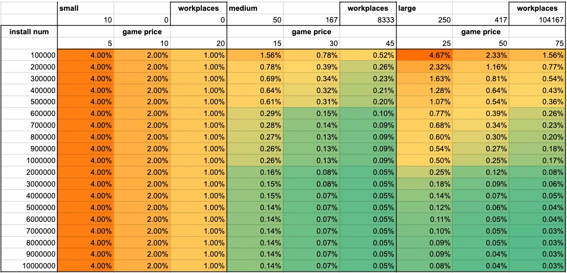 Для малой студии шкала выплат совершенно плоская, плюс они не платят за лицензии — и поэтому вне зависимости от количества установок будут отдавать 4, 2 и 1% дохода соответственно. Кажется вполне подъёмным, на уровне какой-нибудь комиссии платёжной системы.