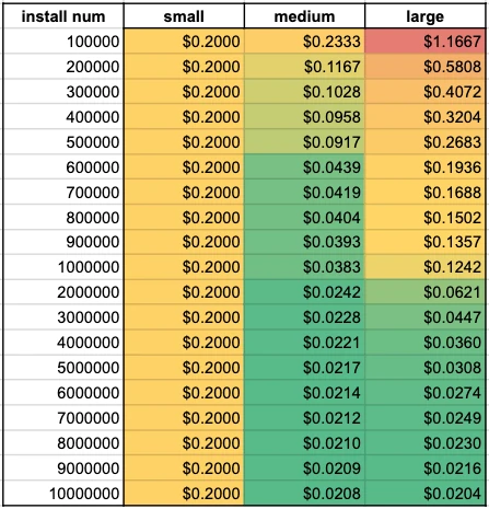 Но посмотрите на «середнячков» — в уме мне казалось, что за счёт платных лицензий суммарный процент у них должен оказаться больше, но, как видите — я ошибся. Расходы очень быстро пикируют ниже процента, расположившись в большей части таблицы на смешных 0.25-0.05%. Это происходит за счёт прогрессивной шкалы выплат, которая от 15 центов при 100 000 установок падает до всего двух при превышении миллиона оных.